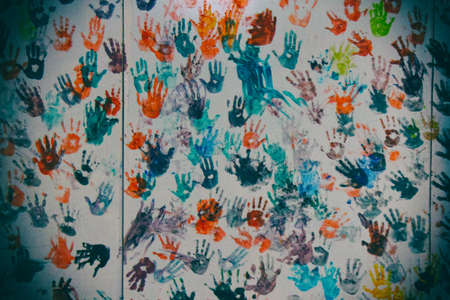Wall painted by colourful children handprint in green, red, yellow, orange, blue and purple.
