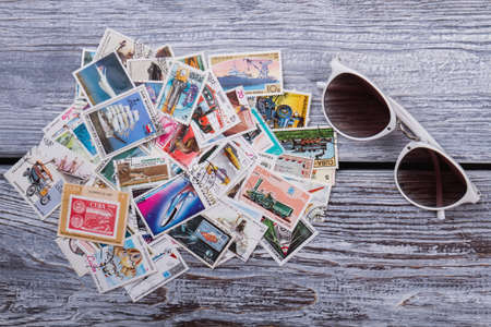 05.01.2017 - Kyiv, Ukraine. Resort travel concept. Heap of stamps and spectacles on the table desk surface.