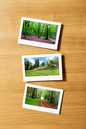 A variety of printed photographs featuring nature scenes, landscapes, and flowers are spread out on a wooden table. The collection includes images of mountains, colorful blooms, and textured stones, suggesting a photography portfolio or selection process.
