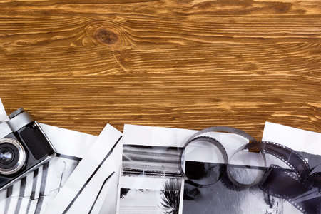 Vintage photo with old camera, photos with film camera on yellow background, old photos with old camera close up nostalgia