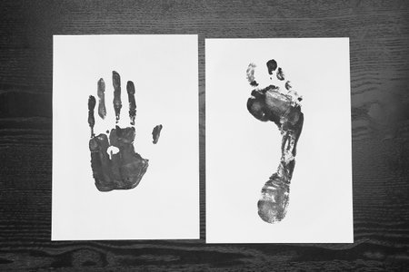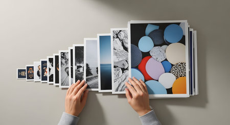top view of the hands of a woman making a selection of a collection of pictures on a selection process of images on a desk after a photoshoot - focus on the center of the image