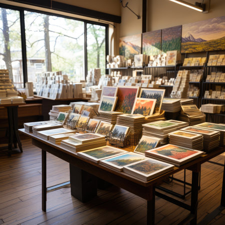 A vibrant art studio showcasing a colorful collection of artwork on a table and wall, illuminated by natural light, creating an inspiring creative space for artists.