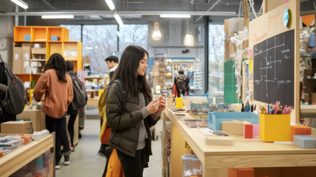 Young woman explores DIY materials in a bustling makerspace, showcasing innovation and creativity