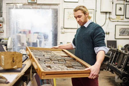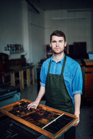 Portrait of young craftsman next to tray of letterpress letters in print workshop