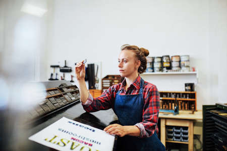 Young craftswoman looking at metal letterpress spacing in a book arts workshop