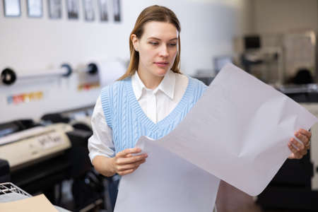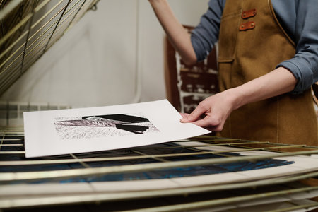 Cropped shot of young unrecognizable female worker of printing center putting paper with artwork sketch on tier of machine