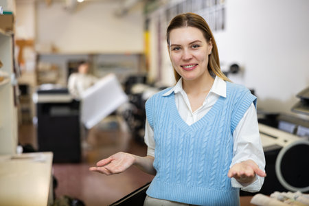 Professional smiling blond woman in sweater worker using printer cutter in workshop. Print office. Carving sheets paper