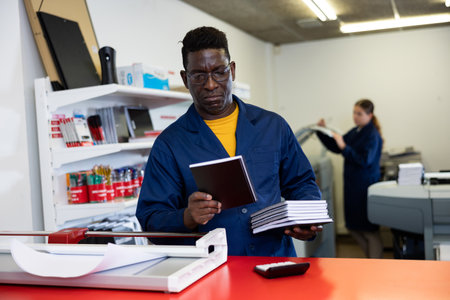 Portrait of serious middle-aged African American man in uniform checking printed samples of notebooks in printer shop