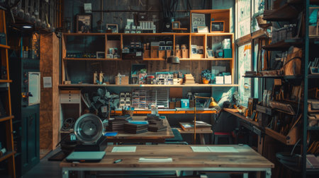 Vintage workspace featuring wooden furniture and decor elements. Cozy and nostalgic atmosphere perfect for creative and inspirational settings.