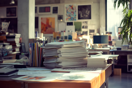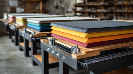 A vibrant display of stacked papers in a printmaking studio highlights the creative potential of various colors and textures, perfect for artists and crafters.