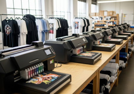 Multiple roll-to-roll fabric printers are arranged on a wooden table, displaying colorful designs and textiles in a bright, spacious printing workshop atmosphere