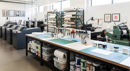 A bright and organized printmaking workshop or graphic design studio. The space is equipped with modern printing presses, large workstations, paper storage racks, inks, and various art tools.