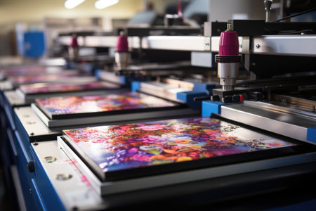 Colors burst forth from the printing machine as sheets filled with vivid images roll out in a bustling workshop. Advanced technology captures artistic designs in dynamic detail.