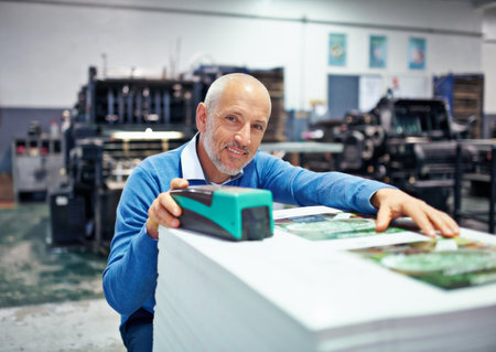 I always have the final say. Portrait of a man checking the quality of a print run in a factory.