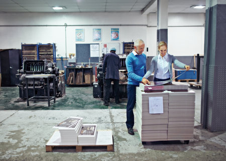 Checking the latest print run. two colleagues inspecting inventory in a printing factory.