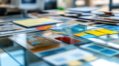 A dynamic workspace featuring a clear glass table filled with colorful paper samples and tools, reflecting creativity and organization in a modern office setting.