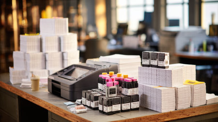 A vibrant office desk filled with stacks of printer paper, colorful ink cartridges, and essential stationery items in a bright workspace setting.