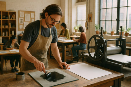 Printmaker applying black ink on a plate using a roller, in a workshop with other colleagues working, and a printing press in the background