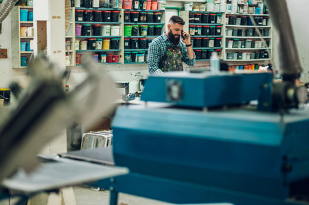 Male worker holding a screen printing film in a workshop and using a smartphone