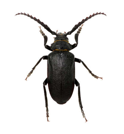 Big black bug isolated. Longhorn Beetle on white background. Macro photography of black insect with long antennae Saperda inornata.
