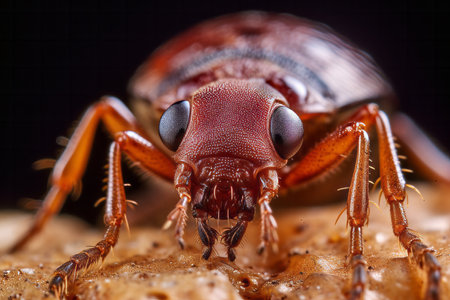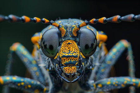 The intricate details of an insects face show its textured body large eyes and unique antennae under controlled lighting highlighting natures design.