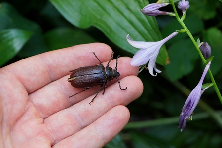 beetle with a big mustache, sitting on a piece of bark and looking into the cloudy distance