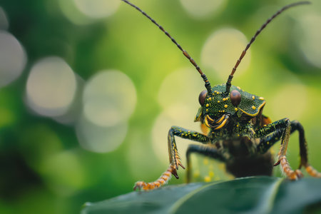 Black beetle perched on vibrant leaves, showcasing intricate details and textures. Nature and entomology concept with green background.