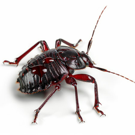 A striking close-up of a black cockroach on a soft pastel pink background, highlighting intricate textures and details, perfect for educational and artistic uses.