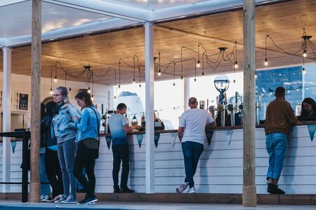 London, UK - June 22, 2019: People ordering drinks from a bar at the Summer by the River open air festival taking place in 2019 in London Bridge, London. During blue hour, selective focus.