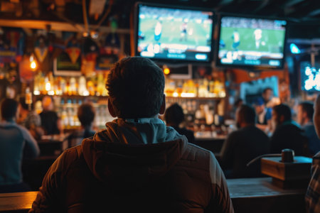 Man watching football game in sport bar. People drinking beer and watching soccer match on television in pub