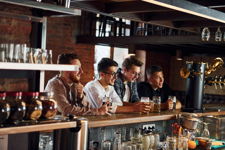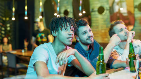 Beer for good friends, three young men drinking beer while watching the match, friends spending time at sport bar, enthusiastic about the game
