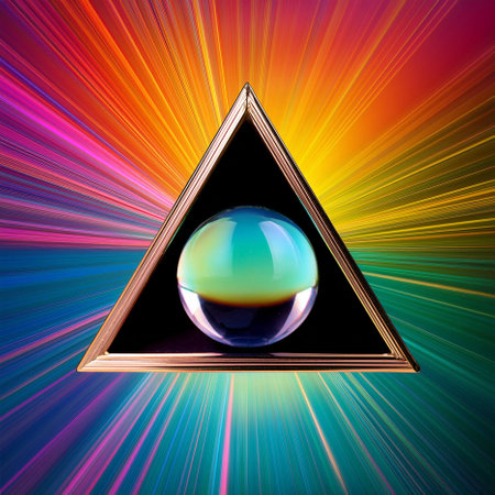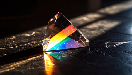 A geometric crystal triangle prism casts colorful rainbow light refractions onto a reflective surface.