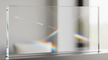 A vibrant prism reflects and refracts sunlight creating colorful patterns against a contemporary background during daytime.