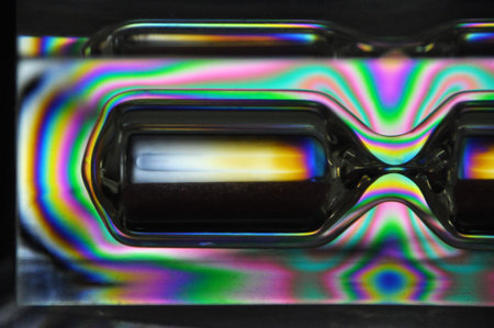 Light beams pass through prisms in a lens array showing varied colors and patterns, positioned for optimal display in an optics setting.