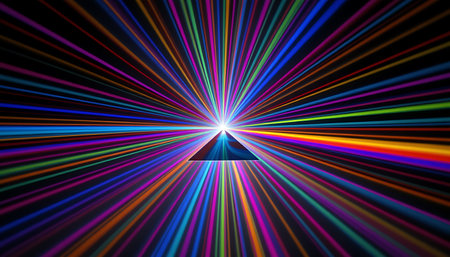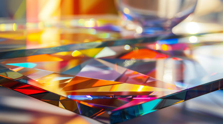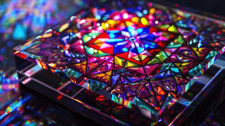 A luminous glass prism illuminates with colorful hues, creating a mesmerizing spectrum of reflections on a shimmering, sparkling surface.