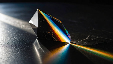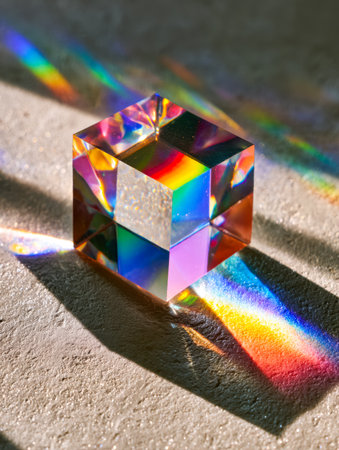 A crystal prism sits on a surface while light refracts, casting vibrant rainbow patterns around the area.