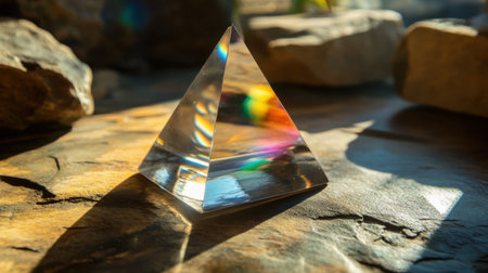 A stunning crystal pyramid placed on a natural stone surface, capturing sunlight and creating vibrant reflections that enhance any artistic decor.