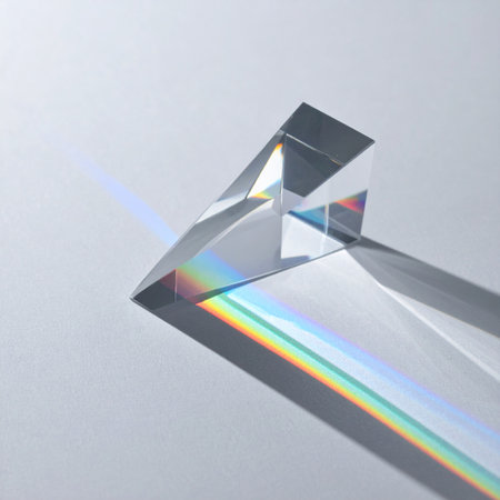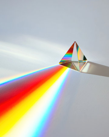 A Prism refracting rainbow colors onto clean white surface, creating vibrant display of light