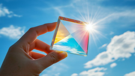 High quality photo of a hand holding a clear glass prism, refracting sunlight into a spectrum of colors, against the backdrop of a calm blue sky with wispy clouds