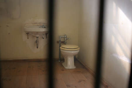 The jail cell is enclosed by thick steel bars, with additional bars on the walls for security. The space is limited, with no windows, offering a stark environment typical of prison settings.