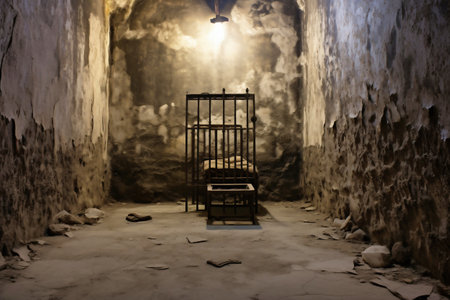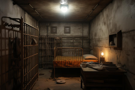 Prison cell, with a focused view on the iron bars, depicting the feeling of confinement and isolation. Generative AI