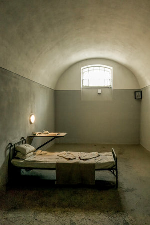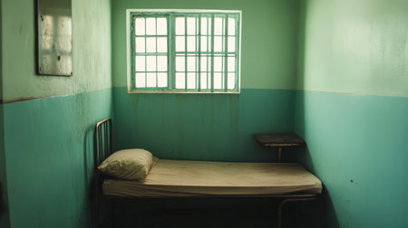 This image captures the stark reality of a prison cell with a simple bed and a small window that allows minimal light, creating an atmosphere of isolation and confinement.
