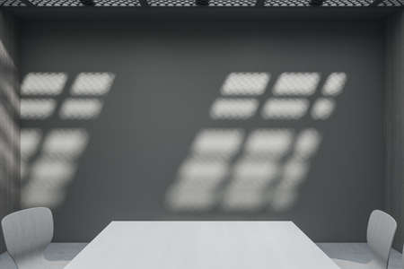 Bright minimalistic concrete meeting room interior with mock up place on wall, window shadows and white table. Law, legal and consulting concept. 3D Rendering