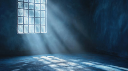 Sunlight beams enter through a large window, illuminating the dark blue room with an ethereal glow.