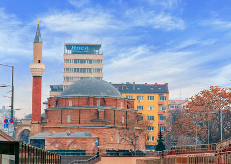 SOFIA, BULGARIA - JANUARY 03: Banya Bashi mosque on Serdica square with underground station and Central Market building, on January 03, 2017 in Sofia, Bulgaria