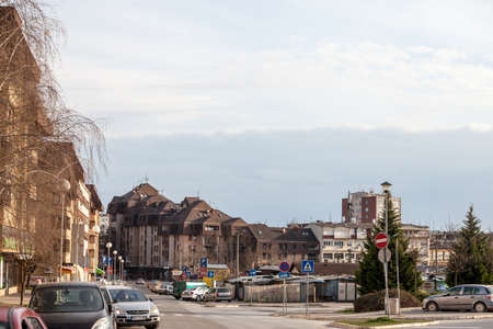 MLADENOVAC, SERBIA - MARCH 28, 2021: City center of Mladenoac, Serbia, with the local green market (pijaca) and the main square of the city. Mladenovac is a city in the suburb of Belgrade.