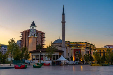 TIRANA, ALBANIA, SEPTEMBER 29, 2019: Sunrise view of Skanderbeg memorial and Ethem Bey mosque in Tirana, Albania