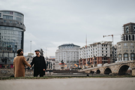 Casual business encounter of two well-dressed men having an engaging discussion with a modern cityscape in the background.