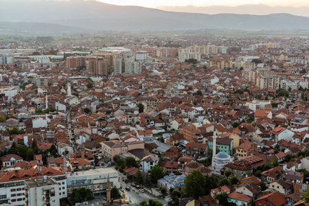 city scape of second bigest city Prizren in Kosovo at sunset with red roofed houses and mosques. In the background a mountain range.