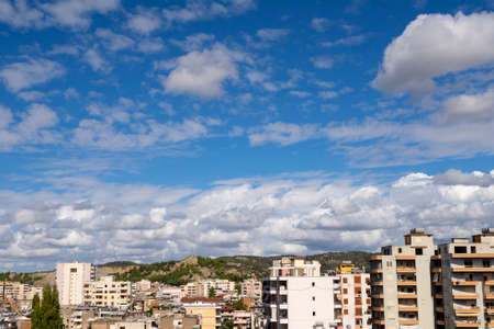 City under blue sky with scenic fluffy clouds